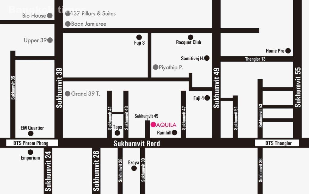 Aquila BangkokはBTSプロンポン駅まで徒歩8分の好立地にあり、BTSトンロー駅までも徒歩圏内になります。Aquila Bangkokのあるスクンビット45は短い通りになりますので商業施設やスーパーはありませんが、最寄りにTopsスーパーマーケットや商業施設レインヒルがあり、BTS駅まで徒歩圏内になりますので生活の利便性が非常に良い環境になります。