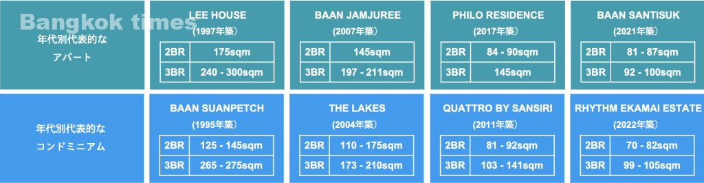 タイの家は広いイメージがあると思いますが、お部屋の面積は年々縮小傾向にあります。2000年頃のご家族用といえば200sqm程度のお部屋が主流でしたが、2010年代築のアパートは80 – 120sqm程度のお部屋が主流です。特にコンドミニアムの場合は分譲価格の高騰で広いお部屋は売れないため、2020年以降は1BRで35-45sqm、2BRで60-80sqm程度とコンパクトなお部屋が目立ちます。また、近年のコンドミニアムは物件に占める1BRの割合が多いのも特徴です。
