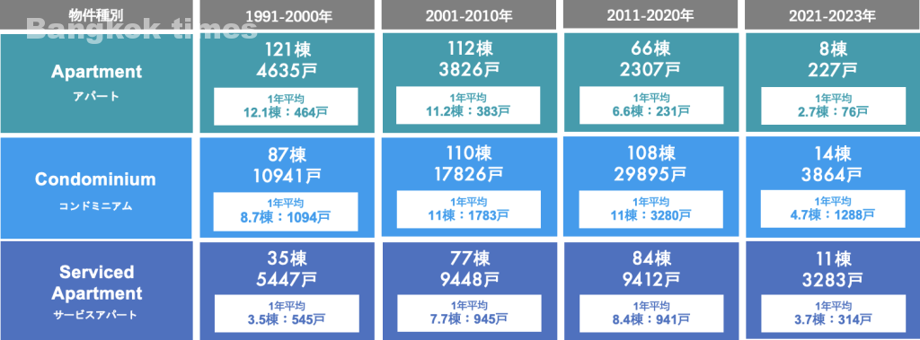 1990年代まではアパートを中心に建設されていましたが、2010年頃から建設される物件はコンドミニアムが中心となり、アパートの建設は極端に減少していっています。バンコク中心地以外のエリアにできる物件の殆どはコンドミニアムで、バンコク中心地でも下記の理由で新たに建設される物件の多くがコンドミニアムもしくはサービスアパート(ホテル)ばかりです。